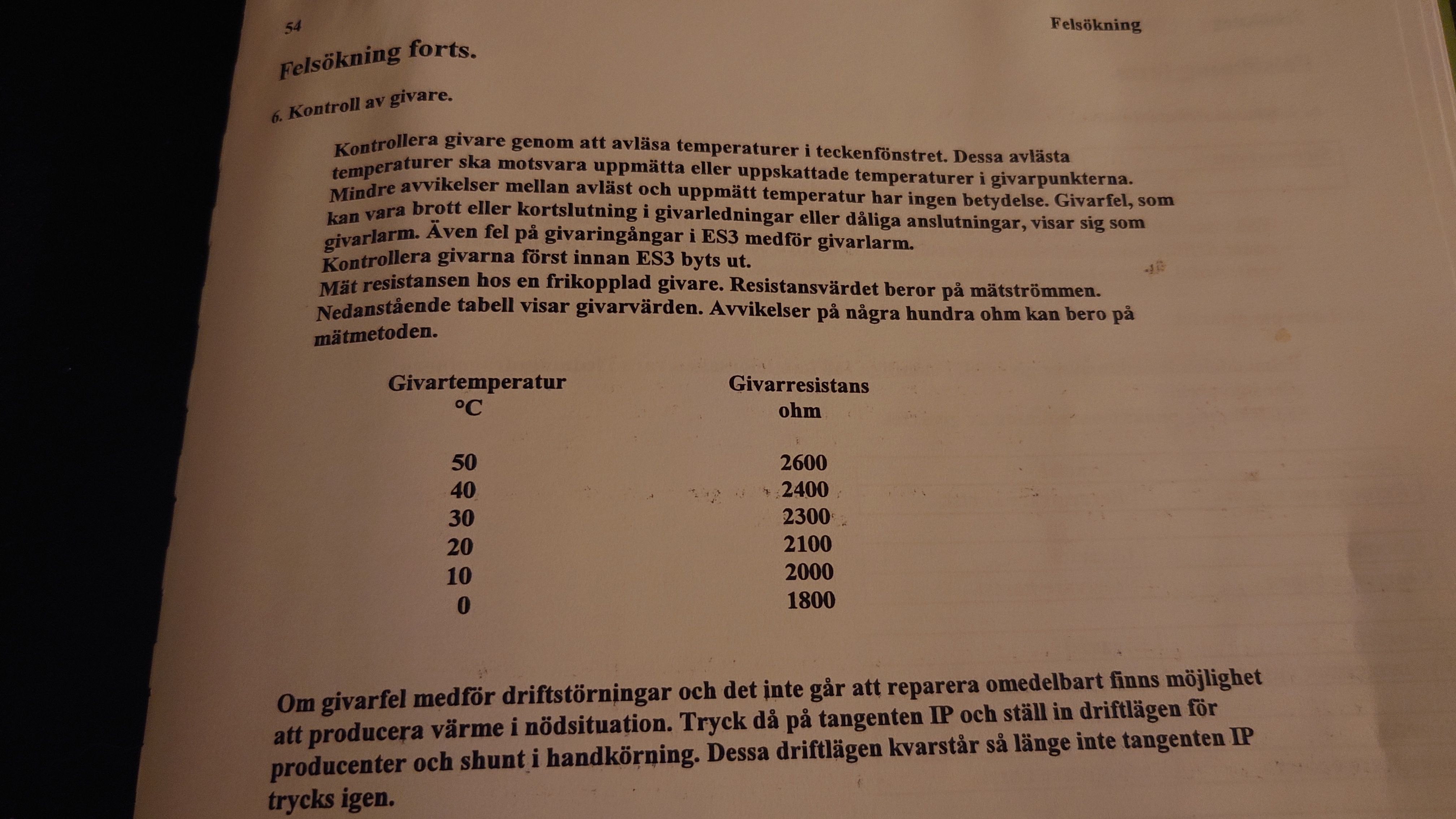 Hej! Jag skulle hjälpa min svärfar att koppla in en rumsgivare till hans jordvärmestyrning tidigare. Han har ett äldre system med en ES3 där manualen säger att den vill ha en ESM-41 givare. Har inte hittat rätt modell, antar att den har utgått eller så. Men efter att jag försökt söka runt så skulle det vad jag kom fram till vara en PT1000 givare. Så jag köpte hem en PT1000 från automation24 https://www.automation24.se/pt1000-rumstemperaturgivare-titec-rtf3-pt1000 Kopplar in den, och kollar aktuell rumstemperatur i ES3 displayen, som säger -63 grader. Kopplar då loss givarkablarna och mäter resistansen, och får ca 1077 ohm som ska motsvara kring 20 grader. Motsvarar inte ESM-41 en PT1000? Kan jag ställa in ES3 till att läsa av en annan givartyp än PT1000? Hittade efter det en tabell i manualen som visar resistansvärden för olika temperaturer. Men det framkommer inte om det är rumsgivare/returtemp/utegivare eller vad den menar. Vet inte om det är samma givare till alla tempmätningar. ![]() Är det någon som vet vilken givare jag kan montera, eller om det går att ändra vilken givartyp ES3 förväntar sig? |