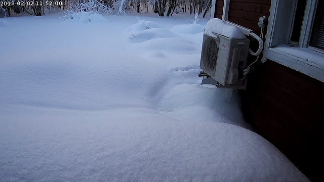 På vintertiden vi bor 600km söderut från detta hus och jag tittar situationen via internet dagligen. Det gick nu 2 månader från Julen till den 25 Februari att där var ingen på platsen, men Fujitsu funkade bra. Jag bara tittade situationen via övervakningskamera hur isberget under utedel växte. Den 25 Februari jag kom till platsen och var tvungen att använda en motorsåg för att få 1m3 isberget borttaget. Från jorden till nedre delen av utedel är 95cm. Bottensplåt av utedel har 20 håler för smältvattnet, varav 12 var helt frusna, men dessa var snabbt öppna när tog jag en propellsgaller bort och genom denna väg hällde jag 1 liter varmt vatten på bottensplåt. Jag lär mig nu att jag måste besöka på platsen lite oftare på vintern.