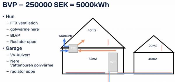 Betydligt styvare investering (men det bästa långsiktigt ) blir ju att dra in en BVP och sedan dra en kulvert till garaget. Samt att kombinera med en FTX. Kommer att ge bäst energi prestanda, bäst innomhus klimat och bäst ekonomi på lång sikt. Nu har jag räknat åt det höga hållet, men avbetalningen på 9-10 år...