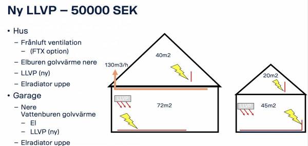 Betydligt styvare investering (men det bästa långsiktigt ) blir ju att dra in en BVP och sedan dra en kulvert till garaget. Samt att kombinera med en FTX. Kommer att ge bäst energi prestanda, bäst innomhus klimat och bäst ekonomi på lång sikt. Nu har jag räknat åt det höga hållet, men avbetalningen på 9-10 år...