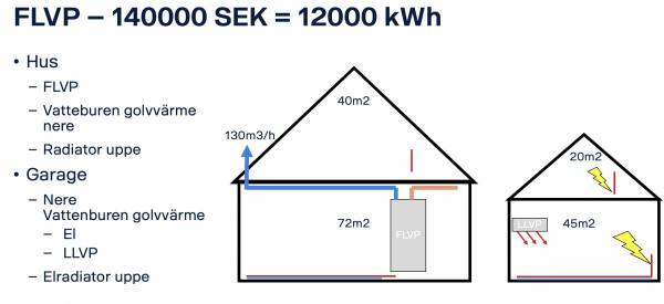 Om man skulle byta ut LLVPn och installera en i garaget borde ge lite. Men då det redan finns en LLVP i huset så blir effekten lite oklar. Att anta att förbrukningnen i garaget bör halveras är nog rimligt.
