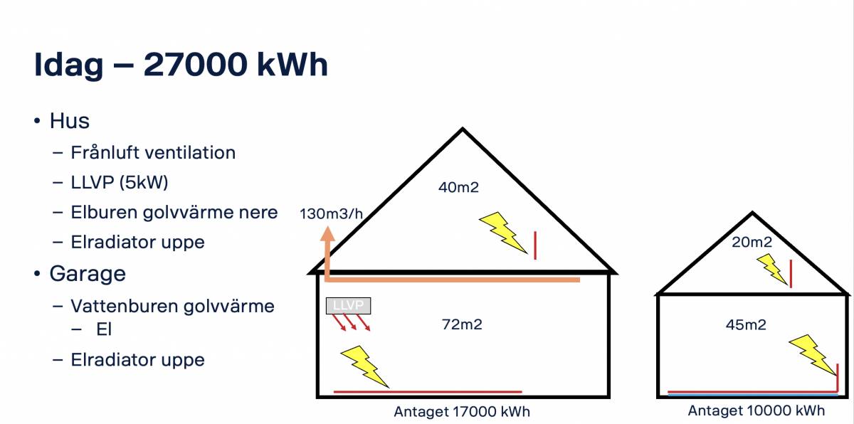 Det nya objektet är en 80 tals kåk om 104 m2 + ett garage om 45 m2. förbruknignen är 27000kWh med LLVP i huset och 13kWp solceller. förstår inte riktigt hur det är möjligt. Isolering 250mm tak, 200mm i väggar och golv. 3-glasfönster. Väggar och fönster i bra skick, taket kommer väl att behöva göras inom en 10 års period. Har ingen aning om vart energin tar vägen.