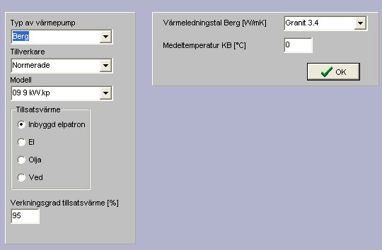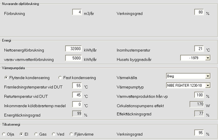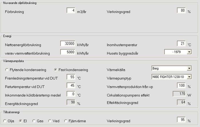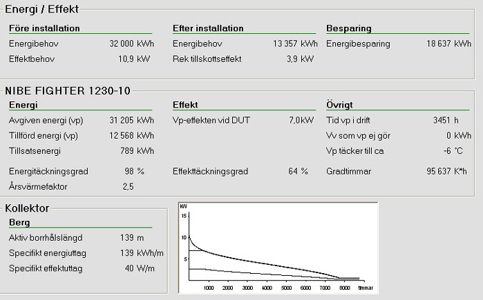 Huset: NIBE 1215-5, 120 m aktivt borrdjup, 127 m2 boyta 53 m2 biyta, suterräng byggt 1970. Tidigare 2,5 kbm olja/år, huset tilläggsisolerat i samband med VP-installationen. FST34+1 som frikyla.