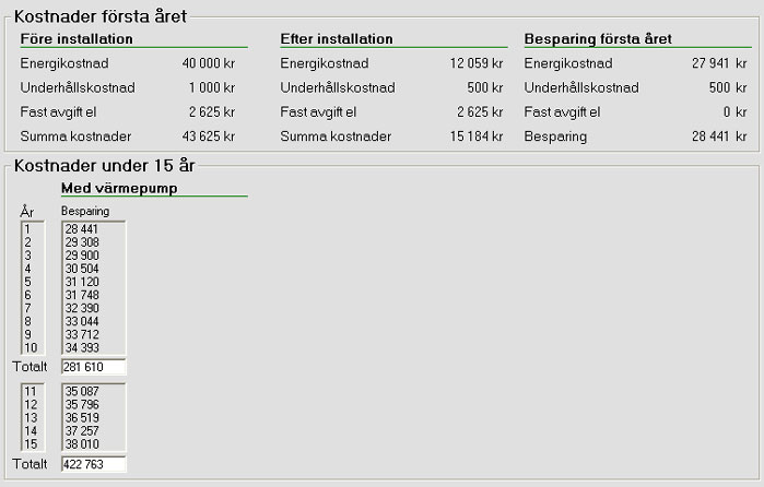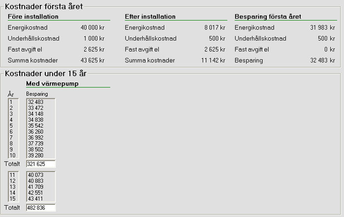 De två andra offerterna grundas på uppskattningen om att vi gör av med 4 kubik olja, skillnad i nettobehov kommer sig av olika uppskattningar av pannans effektivitet (pannan är en "ren" oljepanna Euronom X24 från 2000 med 6 kW elpatron, såvitt jag förstått det bör den vara effektiv). Här har som sagt Thermia uppskattat behovet av borrmarginal till 7 meter, medan IVT 9 räknar med 35 meter marginal. IVT 9 räknar också med genomsnittlig köldbärartemperatur på -1, medan IVT 7 och Thermia 10 räknar med 0 grader.