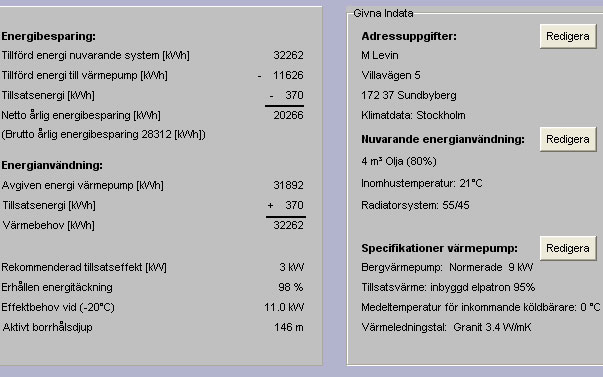 2. Uppskattat nettobehov 31800 kWh, IVT HT+ C9, aktivt borrhål 145 m, totalt borrdjup 180 m
