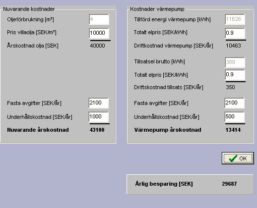 4 m3 olja/år i nuvarande förbrukning (Prestigeprogrammet "tyckte" att det var lite mer än normalt)