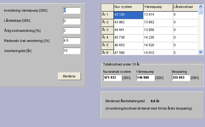 Konverterat från direktverkande elradiatorer till vattenburet och värmepump 2003. Hus: Älvsbyhus -75, Ort PITEÅ, uppvärmd yta ca 170 m2. Värmepump Nibe 1255-12, 500 meter ytjord-kollektor i en slinga, 14 st Korado radiatorer,2-rörs vattenburet system. Utomhuspool 4 X 8 meter som värms med värmepump till ca 32 grader under maj-sept.