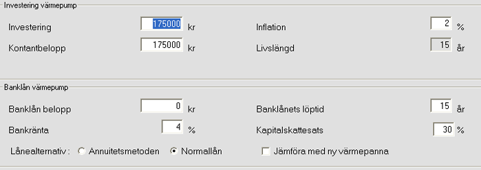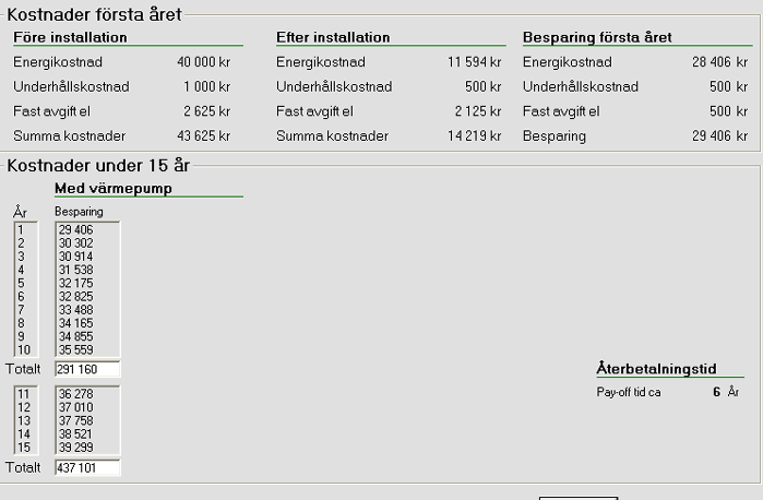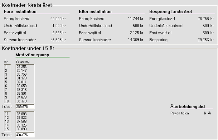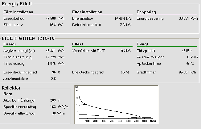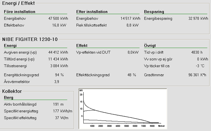 Nedanstående kalkyl har exakt samma förutsättningar för allt utom just värmepumpans storlek och ger då detta utseende.